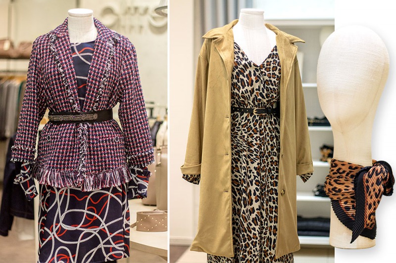 Nel secondo look Oltre presenta l’abito animalier con scollo a V in abbinamento allo spolverino color coccio in nappa dal taglio over.