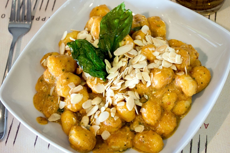 La salsa è a crudo. Gli ingredienti principali sono il basilico, il pomodoro, le mandorle e la ricotta.